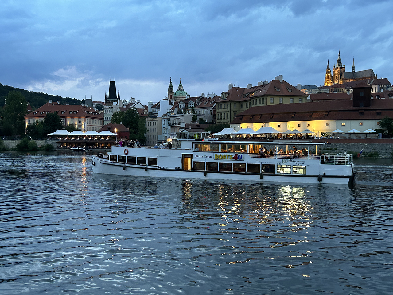 River Boats Prague is a family company operating sightseeing cruises. The historic ship Maria Croon was built in 1927 in Düsseldorf, and although it is one of the oldest boats on the Vltava, thanks to modernization it guarantees comfort in all weathers. In addition to outdoor seating, you can use the covered deck (heated in winter and air-conditioned in summer). The cruise departs from the Na Františku wharf, where it also ends its route. The sailing direction is upstream of the Vltava River under the Cechuv, Manes and Charles Bridges to the Old Town Weir, where it turns and sails back downstream. On the way you will see the Office of the Government of the Czech Republic, Prague Castle, the Rudolfinum or, for example, Museum Kampa. All the information about the route and history can be found in the mobile guide, which you can listen to using the QR codes located on the boat. We recommend bringing your own headphones. Snacks and drinks are not included in the price.