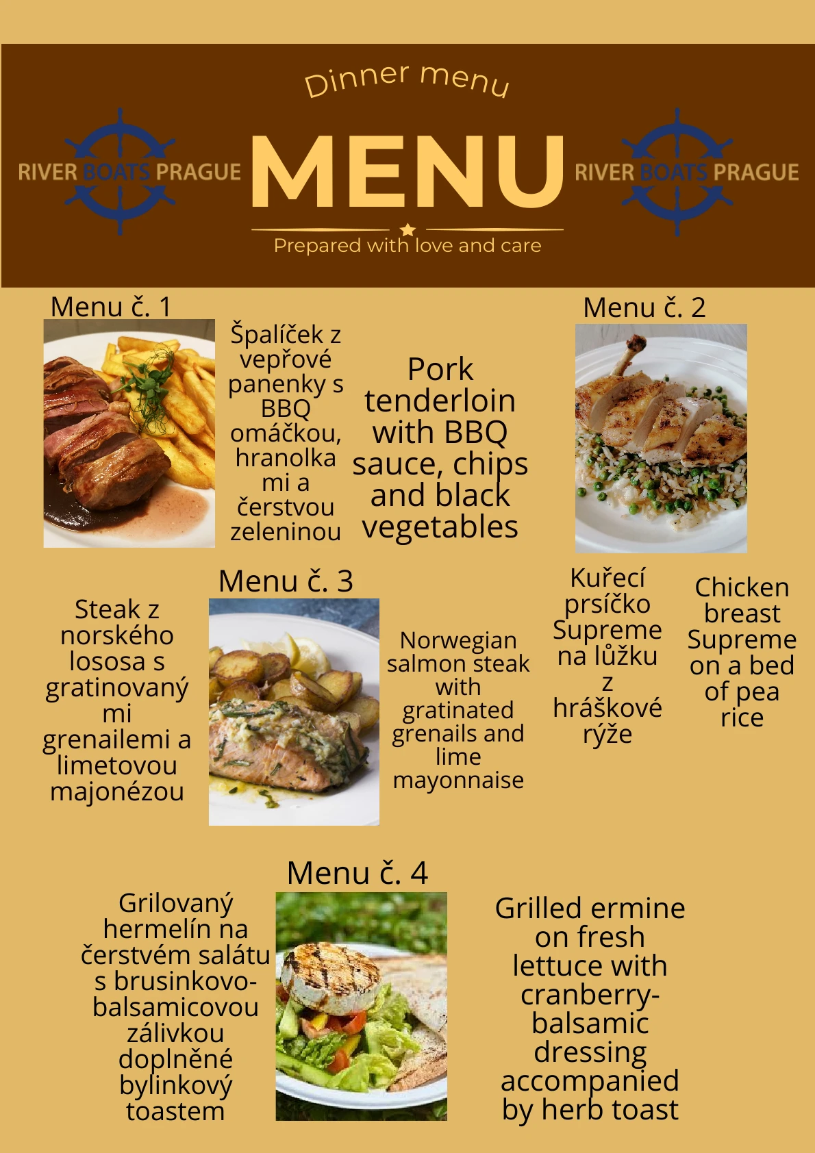 Capacity is limited, so it is necessary to book the cruise at www.riverboatsprague.cz (discount code PVP). When booking, always indicate your chosen meal option – a three-course dinner or a buffet – in the “Message” field of the reservation form. If you choose the served dinner, you must also select a specific main course from four available options (see photo in the gallery).